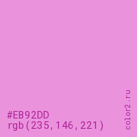 Цвет #EB92DD в цветовой модели RGB обозначается тремя октетами (235, 146, 221) в десятичном формате и #EB92DD в шестнадцатиричном (hex) формате, которые являются интенсивностью красного 235 (hex EB), интенсивность зелёного 146 (hex 92) и интенсивность синего 221 (hex DD).