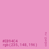 Цвет #EB94C4 в цветовой модели RGB обозначается тремя октетами (235, 148, 196) в десятичном формате и #EB94C4 в шестнадцатиричном (hex) формате, которые являются интенсивностью красного 235 (hex EB), интенсивность зелёного 148 (hex 94) и интенсивность синего 196 (hex C4).