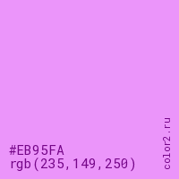 Цвет RGB(235, 149, 250) в процентом отношении количества цвета состоит из 92.2% красного (red), 58.4% зелёного (green) и 98% синего (blue).