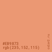Цвет #EB9873 в цветовой модели RGB обозначается тремя октетами (235, 152, 115) в десятичном формате и #EB9873 в шестнадцатиричном (hex) формате, которые являются интенсивностью красного 235 (hex EB), интенсивность зелёного 152 (hex 98) и интенсивность синего 115 (hex 73).