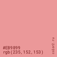 Цвет #EB9899 в цветовой модели RGB обозначается тремя октетами (235, 152, 153) в десятичном формате и #EB9899 в шестнадцатиричном (hex) формате, которые являются интенсивностью красного 235 (hex EB), интенсивность зелёного 152 (hex 98) и интенсивность синего 153 (hex 99).