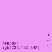 Цвет #EB98F2 в цветовой модели RGB обозначается тремя октетами (235, 152, 242) в десятичном формате и #EB98F2 в шестнадцатиричном (hex) формате, которые являются интенсивностью красного 235 (hex EB), интенсивность зелёного 152 (hex 98) и интенсивность синего 242 (hex F2).
