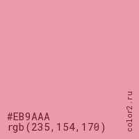 Цвет #EB9AAA в цветовой модели RGB обозначается тремя октетами (235, 154, 170) в десятичном формате и #EB9AAA в шестнадцатиричном (hex) формате, которые являются интенсивностью красного 235 (hex EB), интенсивность зелёного 154 (hex 9A) и интенсивность синего 170 (hex AA).