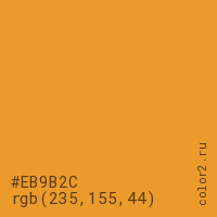 Цвет #EB9B2C в цветовой модели RGB обозначается тремя октетами (235, 155, 44) в десятичном формате и #EB9B2C в шестнадцатиричном (hex) формате, которые являются интенсивностью красного 235 (hex EB), интенсивность зелёного 155 (hex 9B) и интенсивность синего 44 (hex 2C).