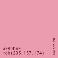 Цвет #EB9DAE в цветовой модели RGB обозначается тремя октетами (235, 157, 174) в десятичном формате и #EB9DAE в шестнадцатиричном (hex) формате, которые являются интенсивностью красного 235 (hex EB), интенсивность зелёного 157 (hex 9D) и интенсивность синего 174 (hex AE).