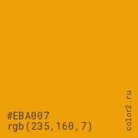 Цвет #EBA007 в цветовой модели RGB обозначается тремя октетами (235, 160, 7) в десятичном формате и #EBA007 в шестнадцатиричном (hex) формате, которые являются интенсивностью красного 235 (hex EB), интенсивность зелёного 160 (hex A0) и интенсивность синего 7 (hex 07).