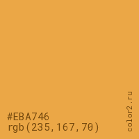 Цвет #EBA746 в цветовой модели RGB обозначается тремя октетами (235, 167, 70) в десятичном формате и #EBA746 в шестнадцатиричном (hex) формате, которые являются интенсивностью красного 235 (hex EB), интенсивность зелёного 167 (hex A7) и интенсивность синего 70 (hex 46).