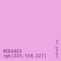 Цвет #EBA8E3 в цветовой модели RGB обозначается тремя октетами (235, 168, 227) в десятичном формате и #EBA8E3 в шестнадцатиричном (hex) формате, которые являются интенсивностью красного 235 (hex EB), интенсивность зелёного 168 (hex A8) и интенсивность синего 227 (hex E3).