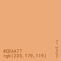 Цвет #EBAA77 в цветовой модели RGB обозначается тремя октетами (235, 170, 119) в десятичном формате и #EBAA77 в шестнадцатиричном (hex) формате, которые являются интенсивностью красного 235 (hex EB), интенсивность зелёного 170 (hex AA) и интенсивность синего 119 (hex 77).