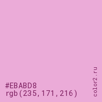 Цвет #EBABD8 в цветовой модели RGB обозначается тремя октетами (235, 171, 216) в десятичном формате и #EBABD8 в шестнадцатиричном (hex) формате, которые являются интенсивностью красного 235 (hex EB), интенсивность зелёного 171 (hex AB) и интенсивность синего 216 (hex D8).