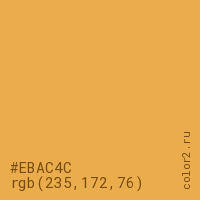 Цвет #EBAC4C в цветовой модели RGB обозначается тремя октетами (235, 172, 76) в десятичном формате и #EBAC4C в шестнадцатиричном (hex) формате, которые являются интенсивностью красного 235 (hex EB), интенсивность зелёного 172 (hex AC) и интенсивность синего 76 (hex 4C).