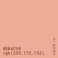 Цвет #EBAC98 в цветовой модели RGB обозначается тремя октетами (235, 172, 152) в десятичном формате и #EBAC98 в шестнадцатиричном (hex) формате, которые являются интенсивностью красного 235 (hex EB), интенсивность зелёного 172 (hex AC) и интенсивность синего 152 (hex 98).