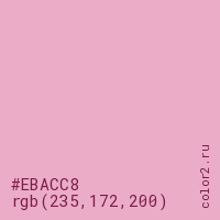 Цвет #EBACC8 в цветовой модели RGB обозначается тремя октетами (235, 172, 200) в десятичном формате и #EBACC8 в шестнадцатиричном (hex) формате, которые являются интенсивностью красного 235 (hex EB), интенсивность зелёного 172 (hex AC) и интенсивность синего 200 (hex C8).