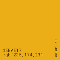 Цвет #EBAE17 в цветовой модели RGB обозначается тремя октетами (235, 174, 23) в десятичном формате и #EBAE17 в шестнадцатиричном (hex) формате, которые являются интенсивностью красного 235 (hex EB), интенсивность зелёного 174 (hex AE) и интенсивность синего 23 (hex 17).