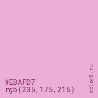 Цвет #EBAFD7 в цветовой модели RGB обозначается тремя октетами (235, 175, 215) в десятичном формате и #EBAFD7 в шестнадцатиричном (hex) формате, которые являются интенсивностью красного 235 (hex EB), интенсивность зелёного 175 (hex AF) и интенсивность синего 215 (hex D7).