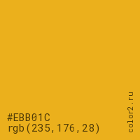 Цвет #EBB01C в цветовой модели RGB обозначается тремя октетами (235, 176, 28) в десятичном формате и #EBB01C в шестнадцатиричном (hex) формате, которые являются интенсивностью красного 235 (hex EB), интенсивность зелёного 176 (hex B0) и интенсивность синего 28 (hex 1C).