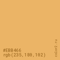 Цвет #EBB466 в цветовой модели RGB обозначается тремя октетами (235, 180, 102) в десятичном формате и #EBB466 в шестнадцатиричном (hex) формате, которые являются интенсивностью красного 235 (hex EB), интенсивность зелёного 180 (hex B4) и интенсивность синего 102 (hex 66).