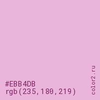 Цвет #EBB4DB в цветовой модели RGB обозначается тремя октетами (235, 180, 219) в десятичном формате и #EBB4DB в шестнадцатиричном (hex) формате, которые являются интенсивностью красного 235 (hex EB), интенсивность зелёного 180 (hex B4) и интенсивность синего 219 (hex DB).
