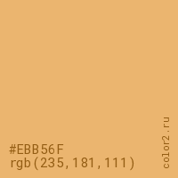 Цвет #EBB56F в цветовой модели RGB обозначается тремя октетами (235, 181, 111) в десятичном формате и #EBB56F в шестнадцатиричном (hex) формате, которые являются интенсивностью красного 235 (hex EB), интенсивность зелёного 181 (hex B5) и интенсивность синего 111 (hex 6F).