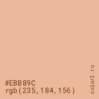 Цвет #EBB89C в цветовой модели RGB обозначается тремя октетами (235, 184, 156) в десятичном формате и #EBB89C в шестнадцатиричном (hex) формате, которые являются интенсивностью красного 235 (hex EB), интенсивность зелёного 184 (hex B8) и интенсивность синего 156 (hex 9C).