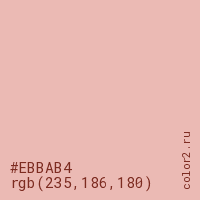Цвет #EBBAB4 в цветовой модели RGB обозначается тремя октетами (235, 186, 180) в десятичном формате и #EBBAB4 в шестнадцатиричном (hex) формате, которые являются интенсивностью красного 235 (hex EB), интенсивность зелёного 186 (hex BA) и интенсивность синего 180 (hex B4).