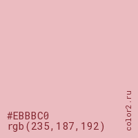 Цвет #EBBBC0 в цветовой модели RGB обозначается тремя октетами (235, 187, 192) в десятичном формате и #EBBBC0 в шестнадцатиричном (hex) формате, которые являются интенсивностью красного 235 (hex EB), интенсивность зелёного 187 (hex BB) и интенсивность синего 192 (hex C0).