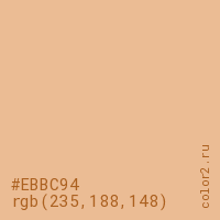 Цвет #EBBC94 в цветовой модели RGB обозначается тремя октетами (235, 188, 148) в десятичном формате и #EBBC94 в шестнадцатиричном (hex) формате, которые являются интенсивностью красного 235 (hex EB), интенсивность зелёного 188 (hex BC) и интенсивность синего 148 (hex 94).