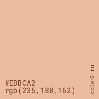Цвет #EBBCA2 в цветовой модели RGB обозначается тремя октетами (235, 188, 162) в десятичном формате и #EBBCA2 в шестнадцатиричном (hex) формате, которые являются интенсивностью красного 235 (hex EB), интенсивность зелёного 188 (hex BC) и интенсивность синего 162 (hex A2).