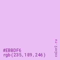 Цвет #EBBDF6 в цветовой модели RGB обозначается тремя октетами (235, 189, 246) в десятичном формате и #EBBDF6 в шестнадцатиричном (hex) формате, которые являются интенсивностью красного 235 (hex EB), интенсивность зелёного 189 (hex BD) и интенсивность синего 246 (hex F6).