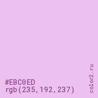 Цвет #EBC0ED в цветовой модели RGB обозначается тремя октетами (235, 192, 237) в десятичном формате и #EBC0ED в шестнадцатиричном (hex) формате, которые являются интенсивностью красного 235 (hex EB), интенсивность зелёного 192 (hex C0) и интенсивность синего 237 (hex ED).