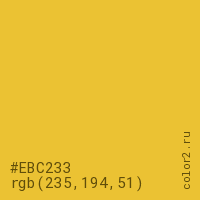 Цвет #EBC233 в цветовой модели RGB обозначается тремя октетами (235, 194, 51) в десятичном формате и #EBC233 в шестнадцатиричном (hex) формате, которые являются интенсивностью красного 235 (hex EB), интенсивность зелёного 194 (hex C2) и интенсивность синего 51 (hex 33).