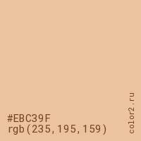 Цвет #EBC39F в цветовой модели RGB обозначается тремя октетами (235, 195, 159) в десятичном формате и #EBC39F в шестнадцатиричном (hex) формате, которые являются интенсивностью красного 235 (hex EB), интенсивность зелёного 195 (hex C3) и интенсивность синего 159 (hex 9F).