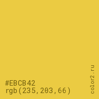Цвет #EBCB42 в цветовой модели RGB обозначается тремя октетами (235, 203, 66) в десятичном формате и #EBCB42 в шестнадцатиричном (hex) формате, которые являются интенсивностью красного 235 (hex EB), интенсивность зелёного 203 (hex CB) и интенсивность синего 66 (hex 42).