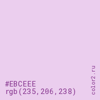 Цвет #EBCEEE в цветовой модели RGB обозначается тремя октетами (235, 206, 238) в десятичном формате и #EBCEEE в шестнадцатиричном (hex) формате, которые являются интенсивностью красного 235 (hex EB), интенсивность зелёного 206 (hex CE) и интенсивность синего 238 (hex EE).