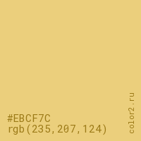Цвет #EBCF7C в цветовой модели RGB обозначается тремя октетами (235, 207, 124) в десятичном формате и #EBCF7C в шестнадцатиричном (hex) формате, которые являются интенсивностью красного 235 (hex EB), интенсивность зелёного 207 (hex CF) и интенсивность синего 124 (hex 7C).