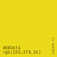 Цвет #EBDA1A в цветовой модели RGB обозначается тремя октетами (235, 218, 26) в десятичном формате и #EBDA1A в шестнадцатиричном (hex) формате, которые являются интенсивностью красного 235 (hex EB), интенсивность зелёного 218 (hex DA) и интенсивность синего 26 (hex 1A).