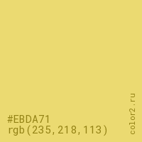 Цвет #EBDA71 в цветовой модели RGB обозначается тремя октетами (235, 218, 113) в десятичном формате и #EBDA71 в шестнадцатиричном (hex) формате, которые являются интенсивностью красного 235 (hex EB), интенсивность зелёного 218 (hex DA) и интенсивность синего 113 (hex 71).