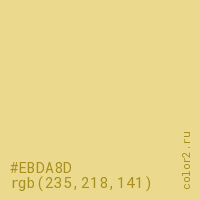 Цвет #EBDA8D в цветовой модели RGB обозначается тремя октетами (235, 218, 141) в десятичном формате и #EBDA8D в шестнадцатиричном (hex) формате, которые являются интенсивностью красного 235 (hex EB), интенсивность зелёного 218 (hex DA) и интенсивность синего 141 (hex 8D).
