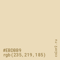 Цвет #EBDBB9 в цветовой модели RGB обозначается тремя октетами (235, 219, 185) в десятичном формате и #EBDBB9 в шестнадцатиричном (hex) формате, которые являются интенсивностью красного 235 (hex EB), интенсивность зелёного 219 (hex DB) и интенсивность синего 185 (hex B9).