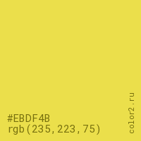 Цвет #EBDF4B в цветовой модели RGB обозначается тремя октетами (235, 223, 75) в десятичном формате и #EBDF4B в шестнадцатиричном (hex) формате, которые являются интенсивностью красного 235 (hex EB), интенсивность зелёного 223 (hex DF) и интенсивность синего 75 (hex 4B).