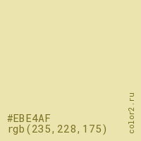 Цвет #EBE4AF в цветовой модели RGB обозначается тремя октетами (235, 228, 175) в десятичном формате и #EBE4AF в шестнадцатиричном (hex) формате, которые являются интенсивностью красного 235 (hex EB), интенсивность зелёного 228 (hex E4) и интенсивность синего 175 (hex AF).