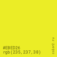 Цвет #EBED26 в цветовой модели RGB обозначается тремя октетами (235, 237, 38) в десятичном формате и #EBED26 в шестнадцатиричном (hex) формате, которые являются интенсивностью красного 235 (hex EB), интенсивность зелёного 237 (hex ED) и интенсивность синего 38 (hex 26).
