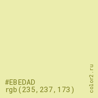 Цвет #EBEDAD в цветовой модели RGB обозначается тремя октетами (235, 237, 173) в десятичном формате и #EBEDAD в шестнадцатиричном (hex) формате, которые являются интенсивностью красного 235 (hex EB), интенсивность зелёного 237 (hex ED) и интенсивность синего 173 (hex AD).