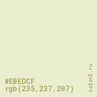 Цвет #EBEDCF в цветовой модели RGB обозначается тремя октетами (235, 237, 207) в десятичном формате и #EBEDCF в шестнадцатиричном (hex) формате, которые являются интенсивностью красного 235 (hex EB), интенсивность зелёного 237 (hex ED) и интенсивность синего 207 (hex CF).