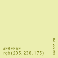 Цвет #EBEEAF в цветовой модели RGB обозначается тремя октетами (235, 238, 175) в десятичном формате и #EBEEAF в шестнадцатиричном (hex) формате, которые являются интенсивностью красного 235 (hex EB), интенсивность зелёного 238 (hex EE) и интенсивность синего 175 (hex AF).