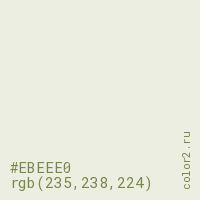 Цвет #EBEEE0 в цветовой модели RGB обозначается тремя октетами (235, 238, 224) в десятичном формате и #EBEEE0 в шестнадцатиричном (hex) формате, которые являются интенсивностью красного 235 (hex EB), интенсивность зелёного 238 (hex EE) и интенсивность синего 224 (hex E0).