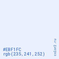 Цвет #EBF1FC в цветовой модели RGB обозначается тремя октетами (235, 241, 252) в десятичном формате и #EBF1FC в шестнадцатиричном (hex) формате, которые являются интенсивностью красного 235 (hex EB), интенсивность зелёного 241 (hex F1) и интенсивность синего 252 (hex FC).