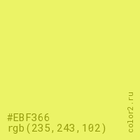 Цвет #EBF366 в цветовой модели RGB обозначается тремя октетами (235, 243, 102) в десятичном формате и #EBF366 в шестнадцатиричном (hex) формате, которые являются интенсивностью красного 235 (hex EB), интенсивность зелёного 243 (hex F3) и интенсивность синего 102 (hex 66).