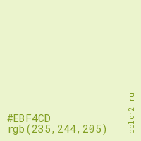 Цвет #EBF4CD в цветовой модели RGB обозначается тремя октетами (235, 244, 205) в десятичном формате и #EBF4CD в шестнадцатиричном (hex) формате, которые являются интенсивностью красного 235 (hex EB), интенсивность зелёного 244 (hex F4) и интенсивность синего 205 (hex CD).