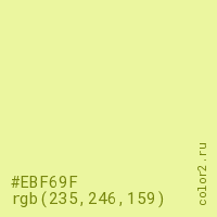 Цвет #EBF69F в цветовой модели RGB обозначается тремя октетами (235, 246, 159) в десятичном формате и #EBF69F в шестнадцатиричном (hex) формате, которые являются интенсивностью красного 235 (hex EB), интенсивность зелёного 246 (hex F6) и интенсивность синего 159 (hex 9F).